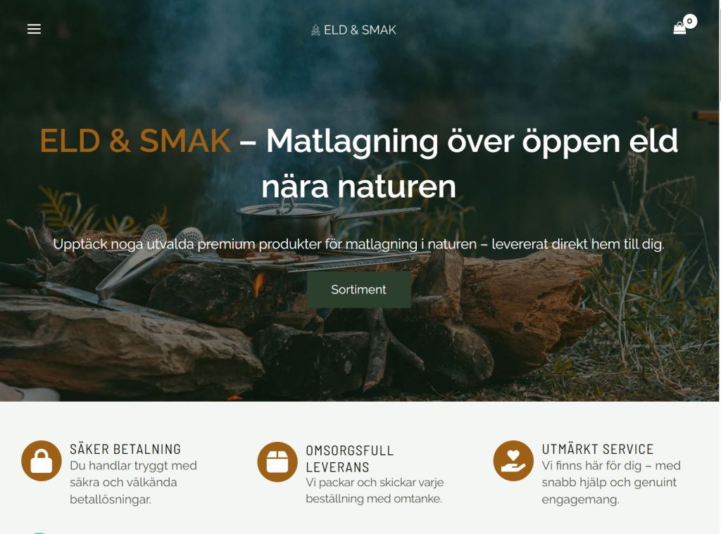 Eld & Smak är ett passionerat varumärke för utomhusmatlagning. Här jobbade jag med allt från idé och namn till färgpalett, bildval, tonalitet och SEO-struktur. En hemsida som kombinerar inspiration med e-handelsstrategi.