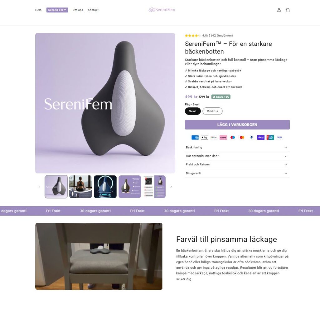 Jag tog fram hela varumärkesidentiteten för SereniFem, inklusive namn, grafisk profil, färgpalett och tone-of-voice. Utöver detta byggde jag upp e-handelslösningen och skapade säljande produkttexter samt annonser för digital marknadsföring.