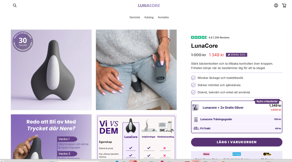 Jag tog fram hela varumärkesidentiteten för LunaCore, inklusive namn, grafisk profil, färgpalett och tone-of-voice. Utöver detta byggde jag upp e-handelslösningen och skapade säljande produkttexter samt annonser för digital marknadsföring.